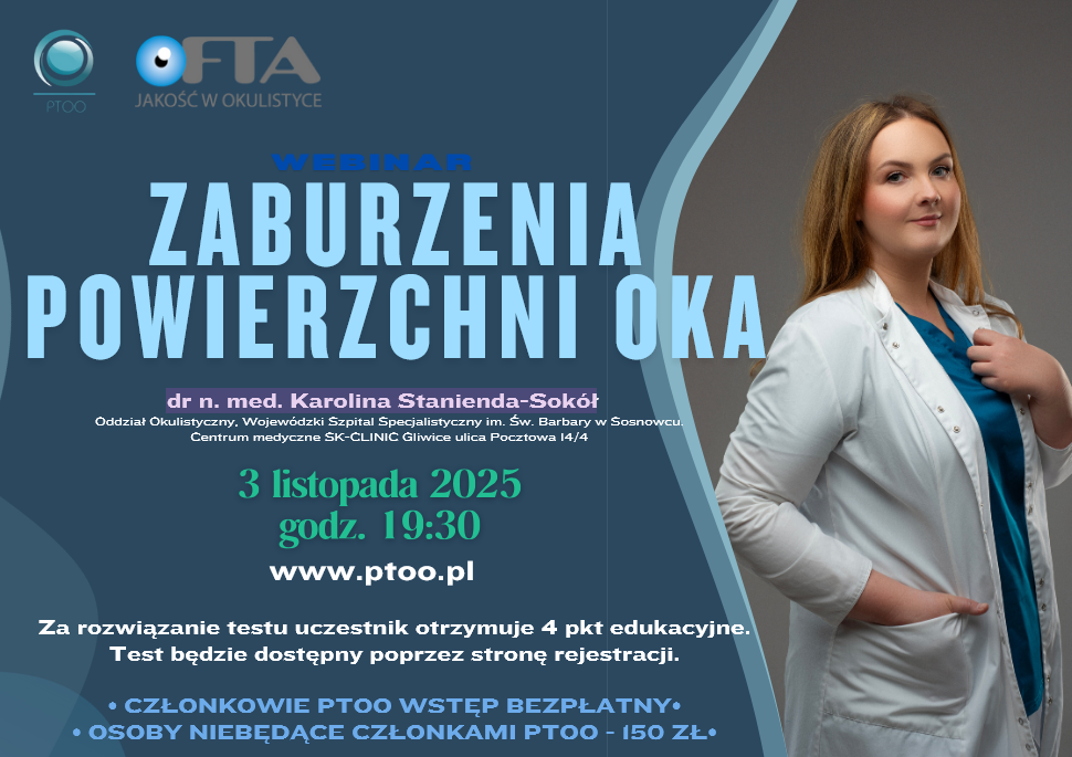 Polskie Towarzystwo Optometrii i Optyki wraz z firmą OFTA zapraszają na webinar pt. "Zaburzenia powierzchni oka", które poprowadzi ceniona ekspertka – dr n. med. Karolina Stanienda-Sokół !